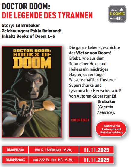- Doctor Doom: Die Legende eines Tyrannen (11.11.25) – die Lebensgeschichte von Victor von Doom, geschrieben von Ed Brubaker. Hier werde ich mir wahrscheinlich die limitierte Hardcover-Ausgabe gönnen.